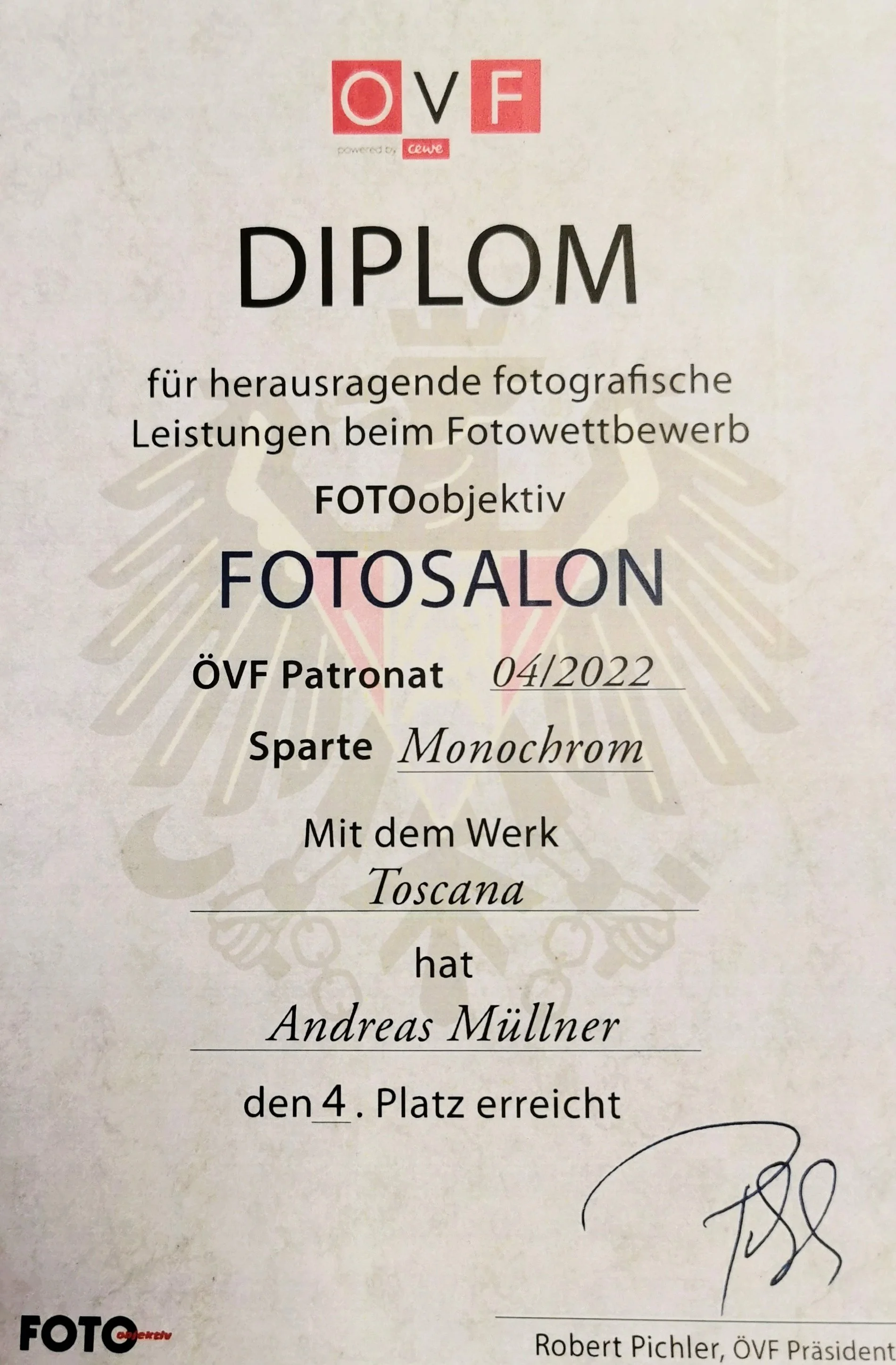 Mit meinem Bild “Toscana” welches auch bei den Monoawards erwähnt wurde, schaffte ich beim Bewerb des Fotosalons des ÖVF im Jahre 2022 den stolzen 4. Platz in der Sparte Monochrome.